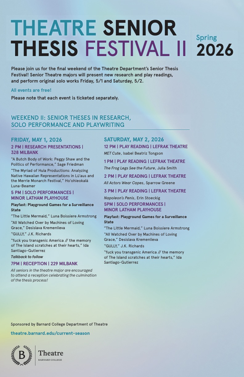 WEEKEND II: SENIOR THESES IN RESEARCH, SOLO PERFORMANCE AND PLAYWRITING